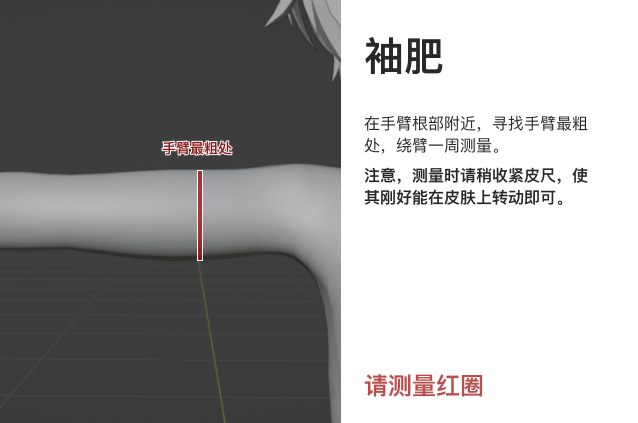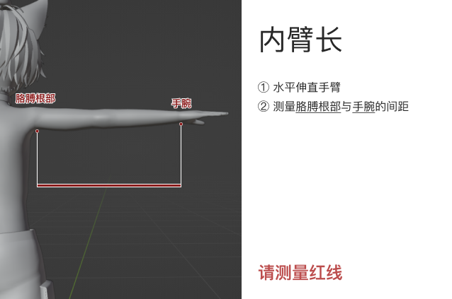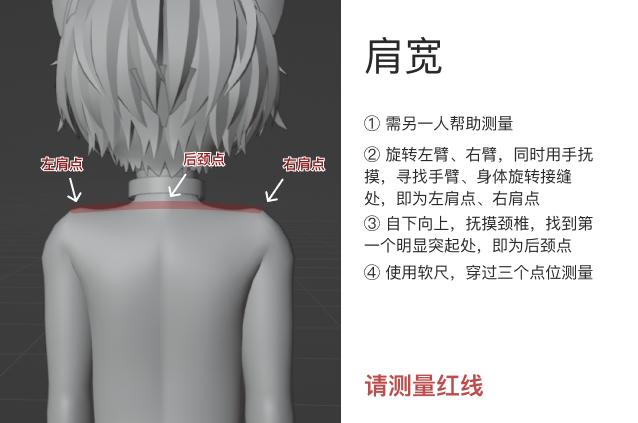 | 8 | 肩宽(cm) | ![]() | 测量肩部关节(① ②)之间的直线距离(③),推荐在墙上画线测量 |